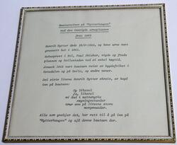 Subject Fotografi av Bautasteinen på "Rytterhaugen" ved den innvigde urneplassen. Fotografiet kjem frå 1962. Det står vidare: "Jonsok 1952 vart bautaen reist av bygdefolket i Ustedalen og på Geilo, og andre vener. Dei siste linene Henrik Rytter skreiv, er hogd inn på bautaen: Og likevel ja, likevel mi ånd i nattemyrke røyningsstunder trur enn på livsens store morgonunder". Vedlagt fotografiet følgjer ei informasjonstekst. Både foto og tekst er i glas og ramme. Biletet av bautaen har måla 12,2 x 17,2 cm, medan teksten har måla 18 x 18 cm.