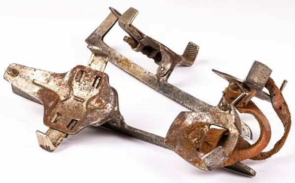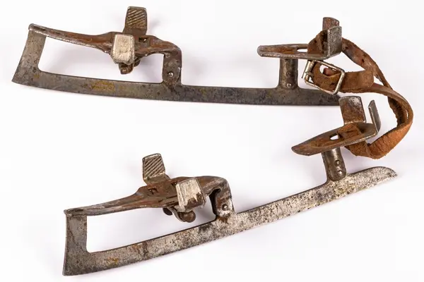 Kat. kort: Skridskor, par, att fästa på skorna. Av smidesjärn med läderrem (ev dithörande?). Fotbredden ställbar med tvärställt fotstöd vilket regleras med skruvanordning (horisont...