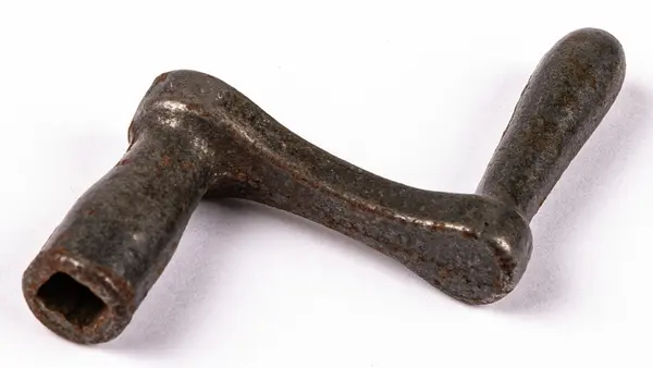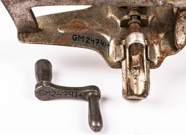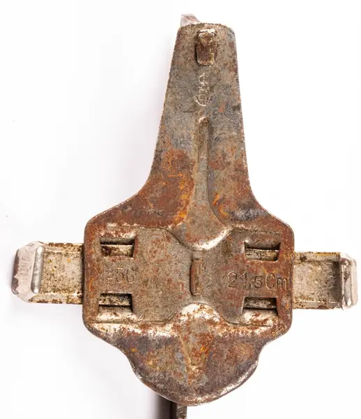 Kat. kort: Skridskor, par, att fästa på skorna. Av smidesjärn med läderrem (ev dithörande?). Fotbredden ställbar med tvärställt fotstöd vilket regleras med skruvanordning (horisontalt ställd). Vev medföljer. Märkta: " " samt "No 56 21.5 cm".