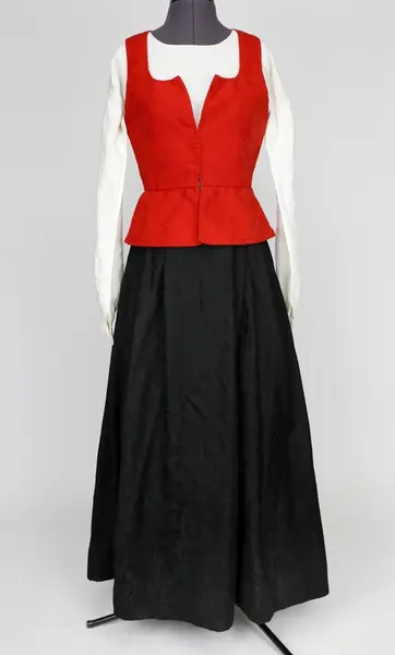 Rød understakk med vid kappe nedrst og lomme. løpegang og snøring i livet. splitt bak.er sydd oppå foldene. Motfolder.