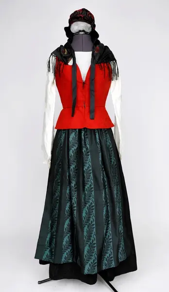 Sør-Østerdalsbunad bestående av skjøteliv, stakk, understakk, forkle, silketørkle og høglue.