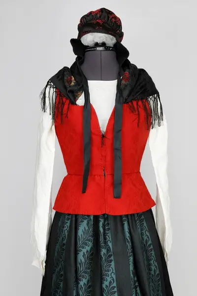 Skjøteliv i rødt fuglestoff. Lukkes med ni hekter.