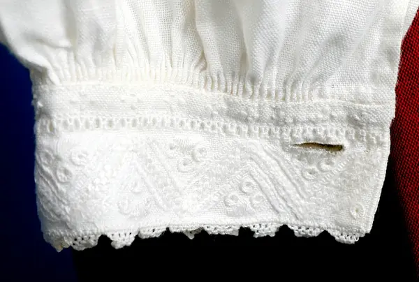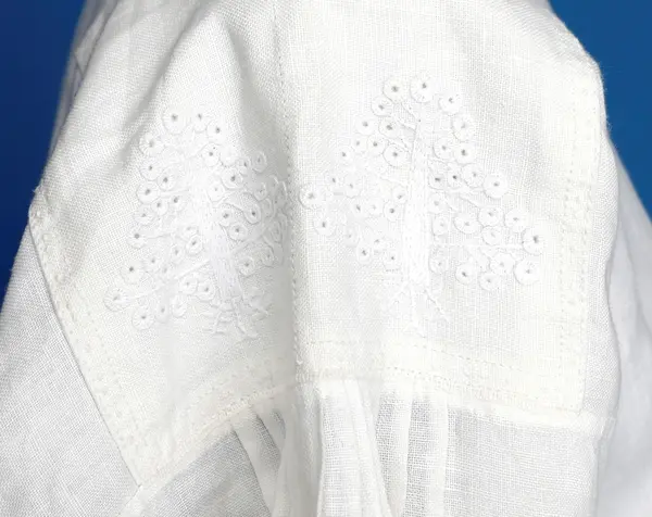 Linskjorte uten krage, med mansjetter. Hvitsømsbroderi.