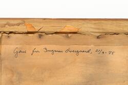På baksida av dette innrammete diplomet har noen skrevet: « Gave fra Ingmar Øvergaard 21/9-75». Det ble funnet i forbindelse med samlingsrevisjonsarbeid sommeren 2021 sammen med flere innrammete fotografier som åpenbart var fra samme aksesjon. Ingen av Hanestad-bildene var merket med museumsnummer. Søk i eksisterende database gav noen treff på giveren Ingmar Øvergaard, blant annet SJF.04753, som hadde med tjæreproduksjonen på Hanestad å gjøre. Bildene så imidlertid ikke ut til å være registrerte. Det eneste bildet Norsk skogmuseum hadde av tjærefabrikken Andreas Mohr Øvergaard og Otto Aakrann drev på Hanestad i perioden 1911-1920 var skannet inn i samlinga etter et innlån av materiale fra Schwencke & Co.s Eftf., se SJF-F.002592. Tjæreproduksjonsbildene og diplomet fra Hanestad ble derfor registrert inn i Skogmuseets samling i forbindelse med den nevnte samlingsrevisjonsprosessen i 2021.