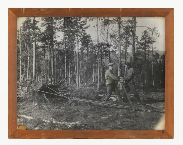 Svart-hvitt-fotografi fra en furuskog, der to karer arbeidet med å bryte opp røtter som sto igjen etter at de største trærne i bestandet var uthogd. Arbeidet ble utført ved hjelp av en slags horisontal jekk. Karene var kledd i busserull og vadmelsbukser. Den ene hadde sixpencelue på hodet, den andre hatt. Vi har ingen informasjon om hvem de kan ha vært. Ut fra aksesjonssammenhengen er det imidlertid nærliggende å anta at bildet er tatt et eller annet sted på skogeiendommen som hørte til garden Østre Hanestad i Rendalen, der skogeieren Andreas Mohr Øvergaard og kollegaen Otto Aakrann fra Elverum drev tjærefabrikk i perioden 1911-1920. Hovedråstoffet i produksjonen var tyriholdige furustubber, som måtte brytes opp av bakken og lufttørkes før veden kunne kjøres til fabrikken, noe som antakelig ble gjort på sledeføre vinterstid.