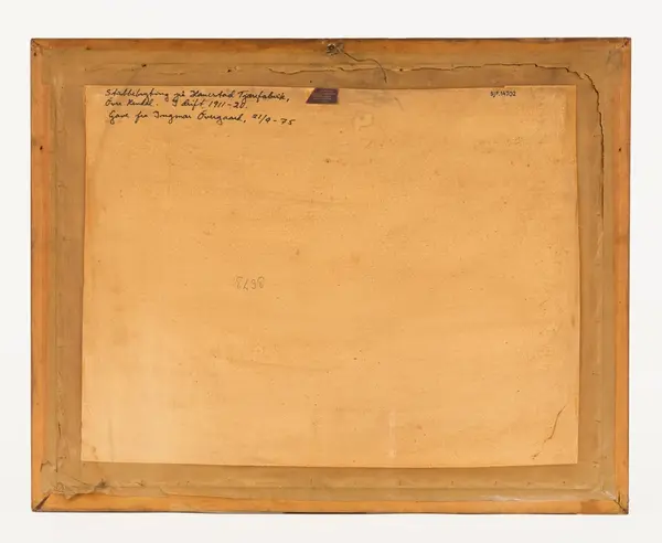 På baksida av dette innrammete fotografiet har noen skrevet: «Stubbebryting på Hanestad tjærefabrik, Øvre Rendal- I drift 1911-1920. Gave fra Ingmar Øvergaard 21/9-75». Fotografiet ble funnet sammen med flere andre som åpenbart var fra samme aksesjon i forbindelse med samlingsrevisjonsarbeid sommeren 2021. Ingen av Hanestad-bildene var merket med museumsnummer. Søk i eksisterende database gav noen treff på giveren Ingmar Øvergaard, blant annet SJF.04753, som hadde med tjæreproduksjonen på Hanestad å gjøre. Bildene så imidlertid ikke ut til å være registrerte. Det eneste bildet Norsk skogmuseum hadde av tjærefabrikken Andreas Mohr Øvergaard og Otto Aakrann drev på Hanestad i perioden 1911-1920 var skannet inn i samlinga etter et innlån av materiale fra Schwencke & Co.s Eftf., se SJF-F.002592. Tjæreproduksjonsbildene fra Hanestad ble derfor registrert inn i Skogmuseets samling i forbindelse med den nevnte samlingsrevisjonsprosessen i 2021.