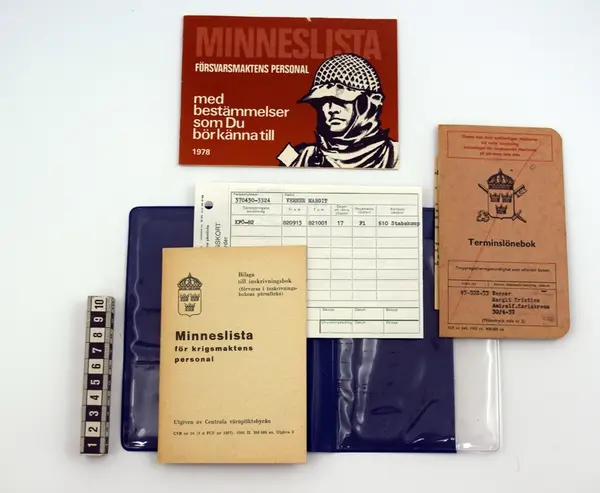 Inskrivnings- och tjänstgöringsbok tillsammans med minnelista för krigsmaktens personal, terminslönebok och id-bricka kom från truppregistreringsmyndigheten och förvarades tillsammans.