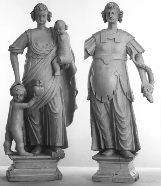 - Staty från gamla korskranket i Heliga Trefaldighets Kyrka i Gävle, av Ewert Friis omkring 1665.