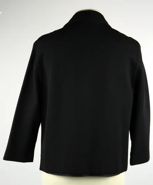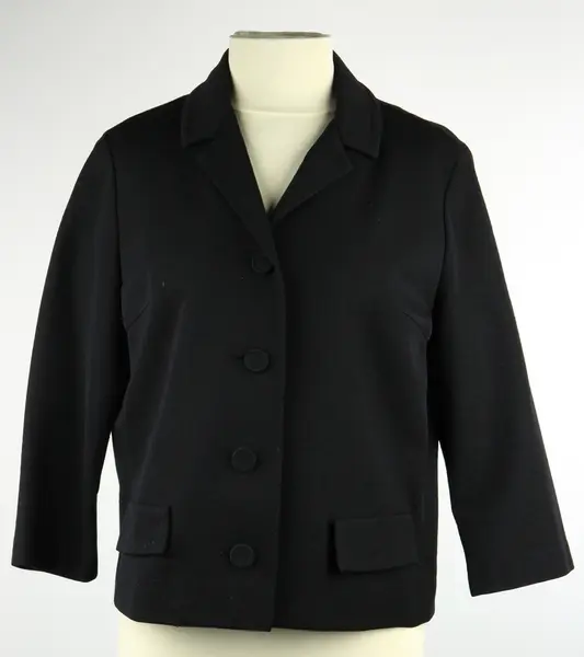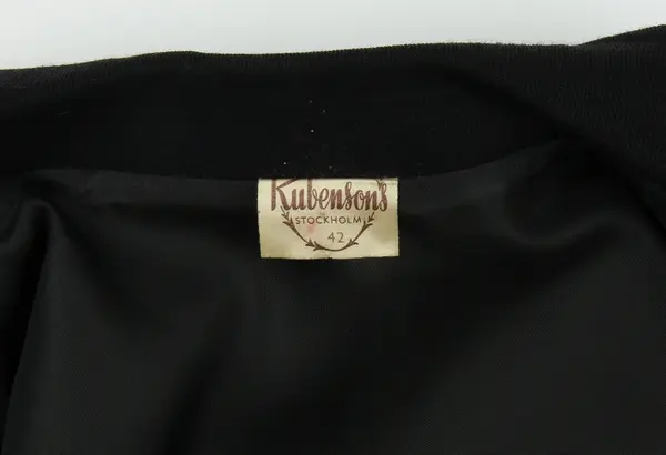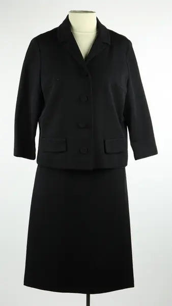 Dräkten (kavaj och kjol a-b) införskaffades till faster Bertas begravning 1965, bars på begravningar fram till 1999. På en begravning 1992 bars till dräkten hatt [NM.0334632] "mörkgrå strumpor (ej svarta), svarta mockaskor [NM.0334631ab] och svart väska med silverfärgad bygel [NM.0334630] ("aldrig guld på begravning" enligt mor). Svarta matta vantar. [trol. nr. NM.334633 eller ev. NM.0334635] Numera vita pärlor i halsen. Tidigare alltid de matta svarta träpärlorna [NM.0334685]. Ofta vit blus (om det inte är nära vän) Silverarmband eller onyxarmbandet (om nära vän) Sorgnäsduk [nr NM.334641 el. NM.0334642 okänt vilken det syftar på] (om nära vän, annars vit)."
