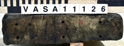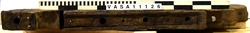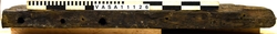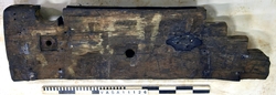 The cheek is the side of a gun carriage. It is made from a single plank of even thickness and width, cut square at the front end, with a rounded upper corner, and in a series of steps at the back end, finishing in a decorative moulding on the last step. There is a semi-circular notch in the upper edge for the trunnion of the gun barrel, a shallow rebate in the upper edge behind this notch for the iron capsquare which held the barrel in place, a similar rebate on the outer face under the trunnion notch for the bolt which held the transom, and a second, shallower rebate of oval [or octagonal] form towards the back end of the outer face for the iron hook for the breech and train tackles. There is a large hole through the cheek for the breeching. The cheek was held to the bed by three forelock bolts, which also held the capsquare in place: one in front of the trunnion notch, which ended in an eye fitted with a wedge to hold the capsquare closed; one directly behind the trunnion which ended in an iron plate, to absorb some of the shock of recoil, and one farther back, which held the capsquare plate. A fourth bolt of similar size held the back end of the capsquare plate, but was a blind drift, and did not reach the bed. The back end of the cheek was held to the bed by large nails driven up through the bed into the lower edge of the cheek, and the straps which held the ends of the axletrees extended well up the cheeks. A thin iron plate was nailed to the top edge in front of the trunnion notch, down the front edge and around to the bottom of the bed. A staple driven into the outer face, near the upper, forward corner took a lanyard for the capsquare wedge, so that it would not be lost.