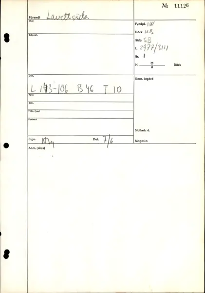 A gun carriage is the four-wheeled wooden construction that carried a cannon, so that it could be aimed, moved about the deck and restrained safely. A carriage consists of eleven wooden elements: a bed (bottom), two cheeks (sides), a transom (a vertical block between the cheeks just under the trunnions of the gun), two axletrees, four trucks (wheels) and an elevation bar. These elements are usually held together by nine heavy iron bolts, a number of nails, and a quantity of iron reinforcing straps and other hardware. The carriage and gun were restrained by breechings, heavy ropes which passed through holes in the cheeks and were tied to ringbolts in the ship’s side, and the gun was manoeuvred with breeching tackles slipped over hooks mounted on the cheeks and held to more ringbolts in the ship’s side, as well as handspikes, heavy wooden levers. 62 carriages were found on the ship, 27 on the upper gun deck, 33 on the lower gun deck, and 2 on the orlop. They are of four different sizes, for four of the five different types of carriage guns carried by the ship (light 24-pounders, heavy 24-pounders, 3-pounders, and howitzers; no carriage survives for the 1-pounders).
