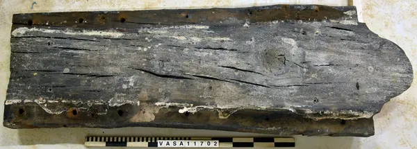 A gun carriage is the four-wheeled wooden construction that carried a cannon, so that it could be aimed, moved about the deck and restrained safely. A carriage consists of ten wooden elements: a bed (bottom), two cheeks (sides), a transom (a vertical block between the cheeks just under the trunnions of the gun), two axles and four trucks (wheels). These elements are usually held together by nine heavy iron bolts, a number of nails, and a quantity of iron reinforcing straps and other hardware. 62 carriages were found on the ship, 27 on the upper gun deck, 33 on the lower gun deck, and 2 on the orlop. They are of four different sizes, for the four different types of carriage guns carried by the ship (light 24-pounders, heavy 24-pounders, 3-pounders, and howitzers) Carriages were manufactured in a specialised workshop, which after 1622 was part of the state shipyard on Skeppsholmen.