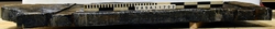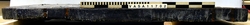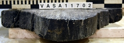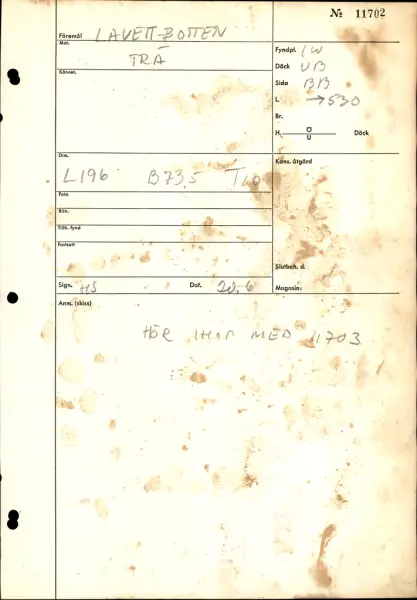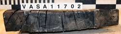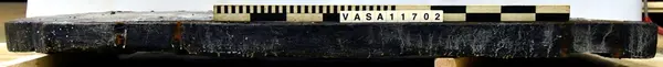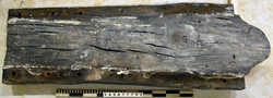 The bed is the base of the gun carriage, to which the other parts are attached; it is used here as the main find number for the carriage as a whole. The bed is a solid plank of even thickness, cut square at the front end and widening towards the back end, which is finished with a rounded, decorative shape extending past the cheeks. There are two shallow rebates across the bottom for the axletrees. There are three bolt holes along each side for the cheeks, as well as a number of nail holes for the cheeks, the axletree, and the iron straps which reinforced these attachments.