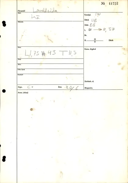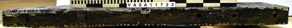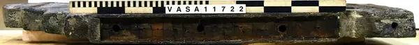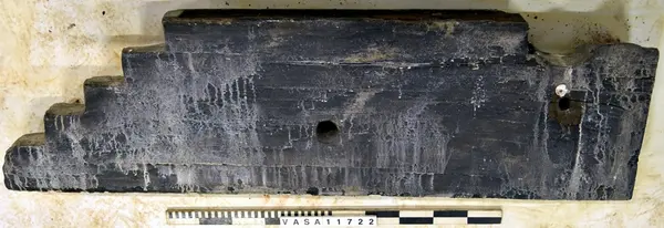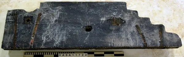 The cheek is the side of a gun carriage. It is made from a single plank of even thickness and width, cut square at the front end, with a rounded upper corner, and in a series of steps at the back end, finishing in a decorative moulding on the last step. There is a semi-circular notch in the upper edge for the trunnion of the gun barrel, a shallow rebate in the upper edge behind this notch for the iron capsquare which held the barrel in place, a similar rebate on the outer face under the trunnion notch for the bolt which held the transom, and a second, shallower rebate of oval [or octagonal] form towards the back end of the outer face for the iron hook for the breech and train tackles. There is a large hole through the cheek for the breeching. The cheek was held to the bed by three forelock bolts, which also held the capsquare in place: one in front of the trunnion notch, which ended in an eye fitted with a wedge to hold the capsquare closed; one directly behind the trunnion which ended in an iron plate, to absorb some of the shock of recoil, and one farther back, which held the capsquare plate. A fourth bolt of similar size held the back end of the capsquare plate, but was a blind drift, and did not reach the bed. The back end of the cheek was held to the bed by large nails driven up through the bed into the lower edge of the cheek, and the straps which held the ends of the axletrees extended well up the cheeks. A thin iron plate was nailed to the top edge in front of the trunnion notch, down the front edge and around to the bottom of the bed. A staple driven into the outer face, near the upper, forward corner took a lanyard for the capsquare wedge, so that it would not be lost.
