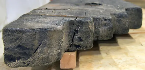 A gun carriage is the four-wheeled wooden construction that carried a cannon, so that it could be aimed, moved about the deck and restrained safely. A carriage consists of eleven wooden elements: a bed (bottom), two cheeks (sides), a transom (a vertical block between the cheeks just under the trunnions of the gun), two axletrees, four trucks (wheels) and an elevation bar. These elements are usually held together by nine heavy iron bolts, a number of nails, and a quantity of iron reinforcing straps and other hardware. The carriage and gun were restrained by breechings, heavy ropes which passed through holes in the cheeks and were tied to ringbolts in the ship’s side, and the gun was manoeuvred with breeching tackles slipped over hooks mounted on the cheeks and held to more ringbolts in the ship’s side, as well as handspikes, heavy wooden levers. 62 carriages were found on the ship, 27 on the upper gun deck, 33 on the lower gun deck, and 2 on the orlop. They are of four different sizes, for four of the five different types of carriage guns carried by the ship (light 24-pounders, heavy 24-pounders, 3-pounders, and howitzers; no carriage survives for the 1-pounders).