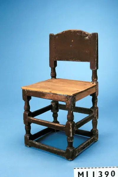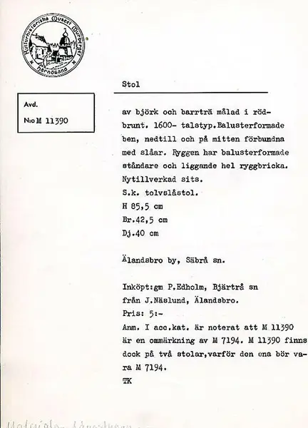 Stol av björk och barrträ målad i rödbrunt. 1600-talstyp. Balusterformade ben, nedtill och på mitten förbundna med slåar. Ryggen har balusterformade ståndare och liggande hel ryggbricka. Nytillverkad sits. Balusterformade och raka fram och bakben förenade med varandra genom tvärslåar vid bak och frambenen samt på sidorna. Fyra t... Stol av björk och barrträ målad i rödbrunt. 1600-talstyp. Balusterformade ben, nedtill och på mitten förbundna med slåar. Ryggen har balusterformade ståndare och liggande hel ryggbricka. Nytillverkad sits. Balusterformade och raka fram och bakben förenade med varandra genom tvärslåar vid bak och frambenen samt på sidorna. Fyra tvärslåar vid benens fötter och fyra i mitten. En rak sarg. Sitsen fastsatt till sargen med hjälp av träpluggar. Ryggpartiet består av balusterformade och korta ryggståndare och en liggande ryggbricka. Ryggbrickan är något avrundad vid överkanten. Stolen är rödmålad. Det finns märkning på baksargens baksida: "nes", "axd" Tillstånd: Färgen är nött. Sidosargarna och sitsen är nya. Enligt liggaren är stolen antingen inkommen 1919 eller 1941.