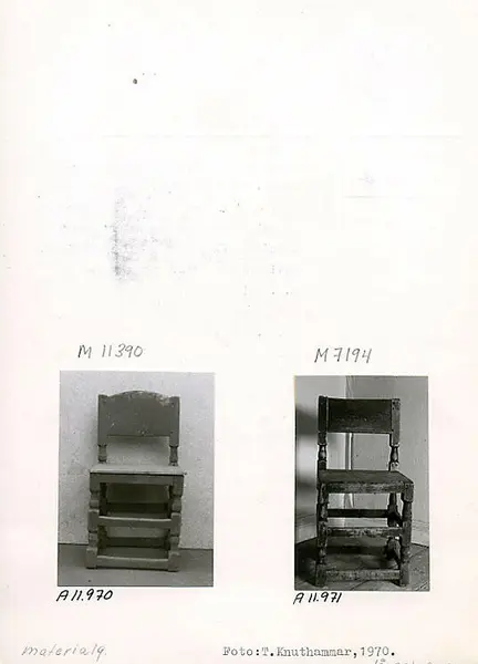 Stol av björk och barrträ målad i rödbrunt. 1600-talstyp. Balusterformade ben, nedtill och på mitten förbundna med slåar. Ryggen har balusterformade ståndare och liggande hel ryggbricka. Nytillverkad sits. Balusterformade och raka fram och bakben förenade med varandra genom tvärslåar vid bak och frambenen samt på sidorna. Fyra tvärslåar vid benens fötter och fyra i mitten. En rak sarg. Sitsen fastsatt till sargen med hjälp av träpluggar. Ryggpartiet består av balusterformade och korta ryggståndare och en liggande ryggbricka. Ryggbrickan är något avrundad vid överkanten. Stolen är rödmålad. Det finns märkning på baksargens baksida: "nes", "axd" Tillstånd: Färgen är nött. Sidosargarna och sitsen är nya. Enligt liggaren är stolen antingen inkommen 1919 eller 1941.