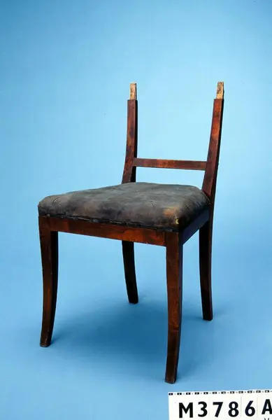 Fyrkantiga, något svängda och konade ben. Sargen är rak. Sitsen är stoppad och klädd i ett grönt tyg. Ett grönt möbelband går runt klädseln. Ryggstycket består av raka och konade ryggståndare, ett rakt och liggande överstycke samt en ryggbricka i form av ett lövblad och stiliserade voluter. Stolen är brunmålad. Emipre. Polerad i... Fyrkantiga, något svängda och konade ben. Sargen är rak. Sitsen är stoppad och klädd i ett grönt tyg. Ett grönt möbelband går runt klädseln. Ryggstycket består av raka och konade ryggståndare, ett rakt och liggande överstycke samt en ryggbricka i form av ett lövblad och stiliserade voluter. Stolen är brunmålad. Emipre. Polerad i mahognyfärg. Fyrkantiga något utsvängda ben. Rak sarg. Böjd formad rygg har raka sidoståndare med tvärslå samt horisontalt, 10 cm brett överstycke och lodrät mittslå. Höjd 82 cm. Rygghöjd 38 cm. Sitsdjup 41 cm. Härnösand. Anm. Enl. intyg skall stolarna ha tillhört biskop F.M. Franzén. Inköpt: J Åmell.