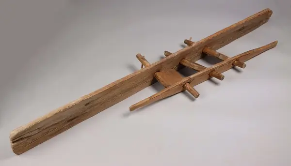 Description A wooden strand twister, one part of a rope twister maschine made for twisting three strands into a rope. It consists of five parts, one tall board with drilled holes, three wooden turning wings and one shorter board with handles at each end. The two boards have drilled holes that keeps the wooden wings attached to the boards