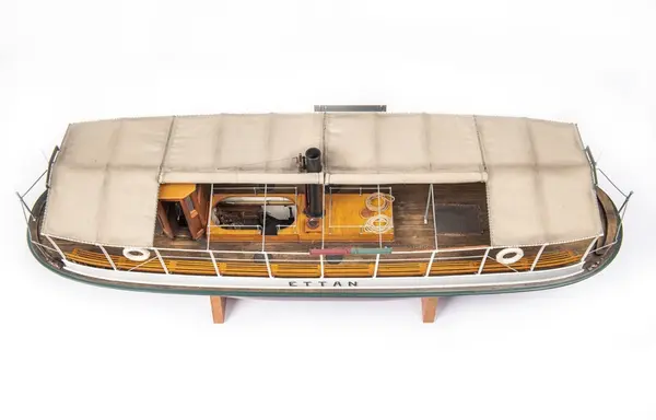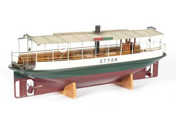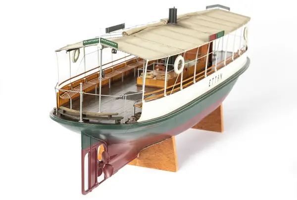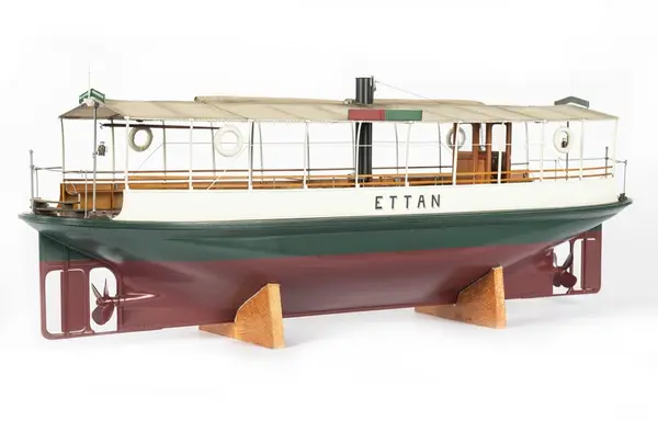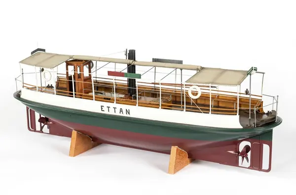 Vid förra sekelskiftet sågs färjorna pila mellan Norr- och Södermälarstrand och mellan Ragvaldsbro och Mälartorget på Riddarfjärden. I museets modellsamling har vi inte haft någon modell av en sådan förrän nu. Du står framför en av museets nyaste och mest fantastiska modeller. (Text från Trappmonter där modellen ställdes ut fr o m januari 2022.)
