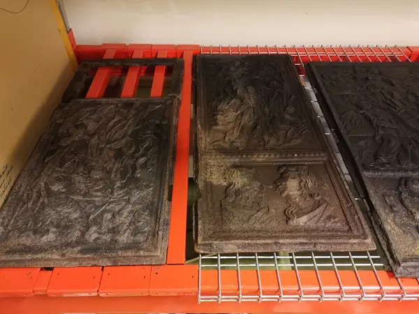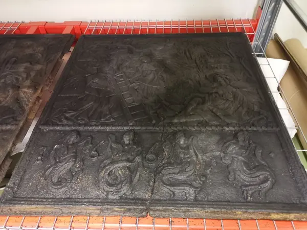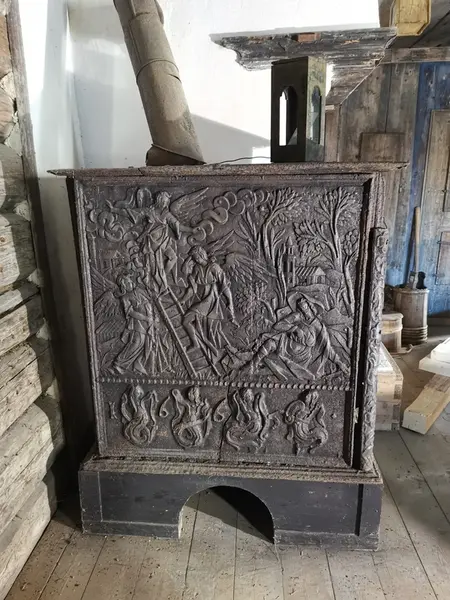 - Vindovn datert 1665. Modellen/motiv på plater har store likhetstrekk med motiver kjent som skåret av " Fossum-mesteren " og er hentet fra Bibelen, 1.Mosebok (Abrahams offer, Jakobs drøm). Ovnen er uten verkssignatur. I boken "Norsk jernskulptur" foreslås Hakedals verk. Motiver og utforming er i samme bok drøftet (bind 1 s. 8ff, katalognr 15). Dekoren typisk sengotikk. Lavt relieff, skarpe foldekast i drakter og stiliserte bladformer. platene holdes sammen av løse, utvendige skinner i hjørnene, ornamentert i støpt relieff. Alt opprinnelig holdt sammen med skruer, mulig formet som messingkuler. Kun del av en skinne er bevart på ovnen.