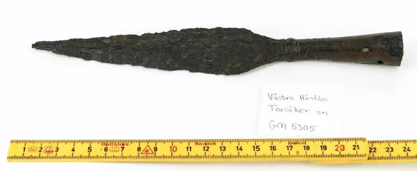 "Å sitt hemma No 6 WesterHästbo, Thorsåker Sn, anträffades detta fynd af Handlanden Anders Perssin u slutet af 1878 under gräfning, det 7 grafvar med ska och ben funnos. Skänktes till Museum af And P. genom Landsfiskalen Alfr. Dumky, 7 januari 1879."