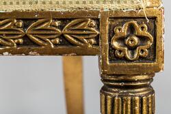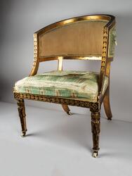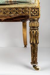 Fast stoppad sits och rygg, med sliten, senare klädsel i grönrandigt siden. Bevarad originalstoppning.