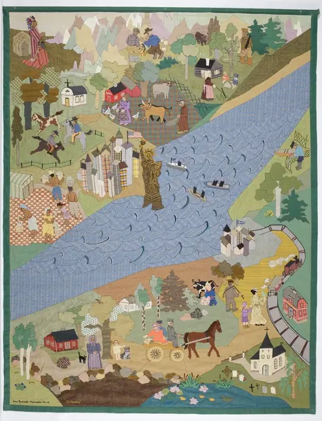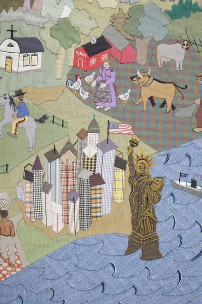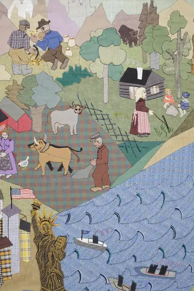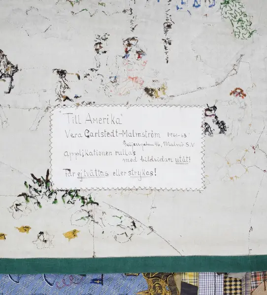 Konstnärinnan hörde på radion under tidigt 1960-tal om det nytilltänkta emigrantinstituet i Växjö, och fick då en idé som blev denna bonad. Hon ville göra textilapplikationen som en hylling till tanken om detta institut, kallat "Till Amerika", som även är en hyllning till hennes mor och mormor.