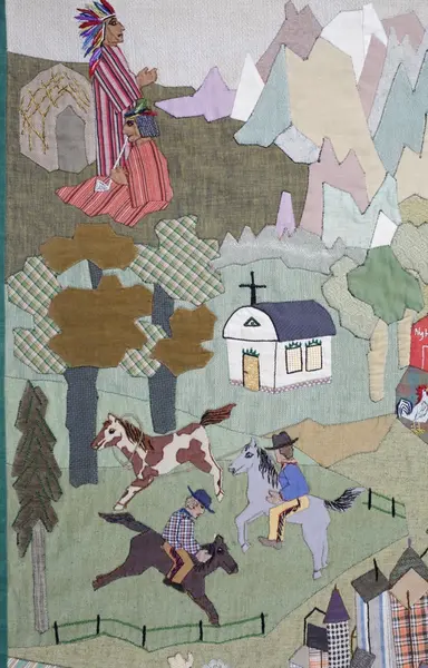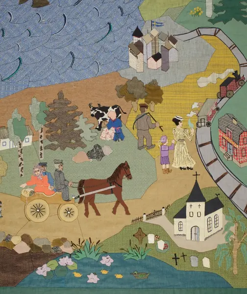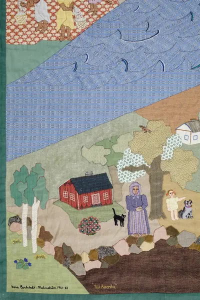 Min Mormor står vid stugan med en av de minsta "glyttarna" och ser långt efter ett par sv barnen som skjutsas av Morfar till stationen. Hon hade fjorton barn själv och tog ett fosterbarn, liten pojke hon tyckte så synd om. Underbar liten gumma, som sydde och vävde och kardade och slet och gjorde allting så vackert. Så finns också på applikationen min Mor i gul klädning, som står med en yngre syster vid sidan och vinkar av Amerikafararna då de skall till Göteborg. Stationen heter "Hemlanda", och hemmet som syns i "staterna" heter "Nyhem".