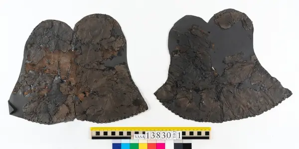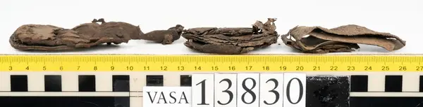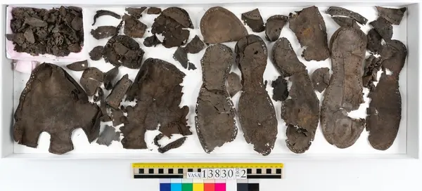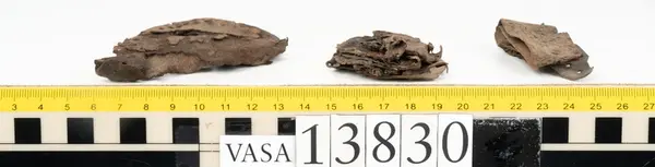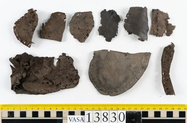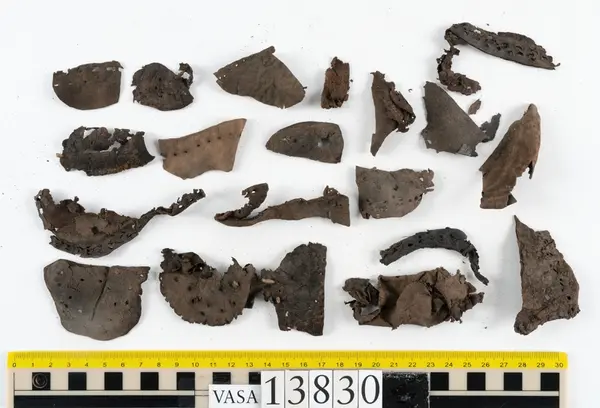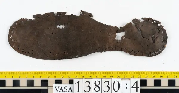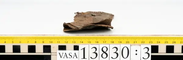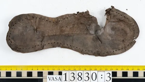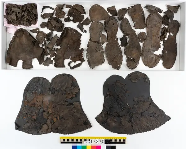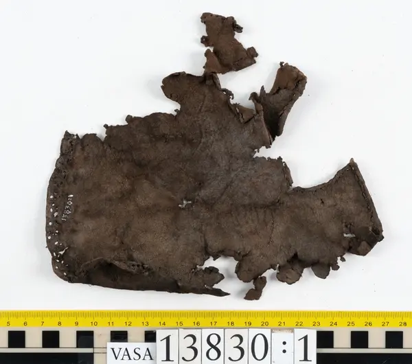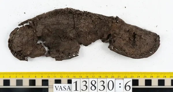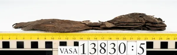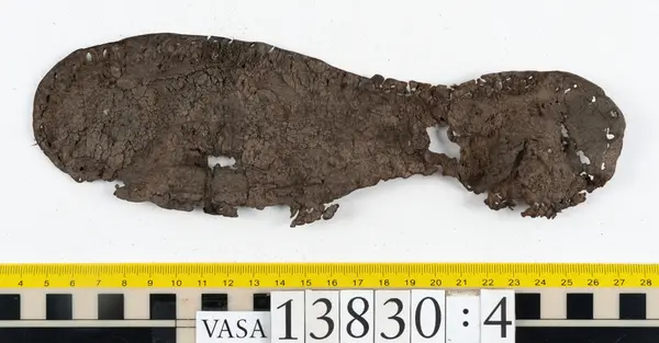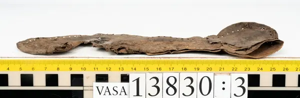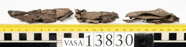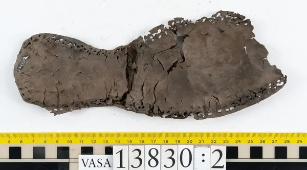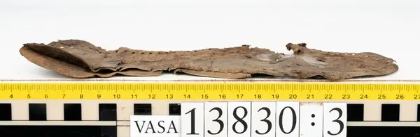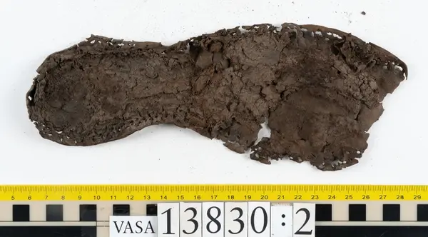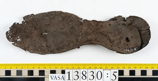 Well over 1400 shoe and boot parts have been found on Vasa. Between the end of the 16th century and the mid 17th century, three types of footwear dominated fashion. These were the latchet shoe, the boot and the pantable slipper, all of which are represented in the Vasa material. The latchet shoe was tied through two straps over the instep. The boot of the early 17th century had a closely fitted shaft of soft leather which could be turned down at the top. Slippers, also called pantables, lacked quarters and often had thicker soles of wood and cork. Some shoes were still made as distinct lefts and rights, although from ca 1580 it was increasingly common to make shoes on an “upright” or straight last, and the shoes would become matched to the left and right foot through wear. Elevated heels first gained popularity throughout western Europe in the late 16th century; before then shoes were flat soled. Both flat soles and elevated heels are seen in the Vasa shoes. Leather of various types could be used for any part of the shoe, but some shoes include birchbark midsole layers for insulation or waterproofing, and pantables often had wood and cork in the sole.