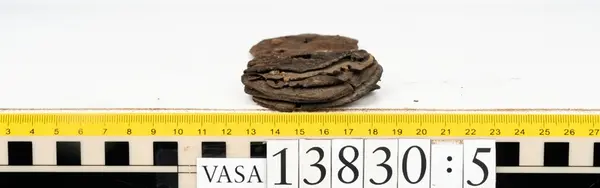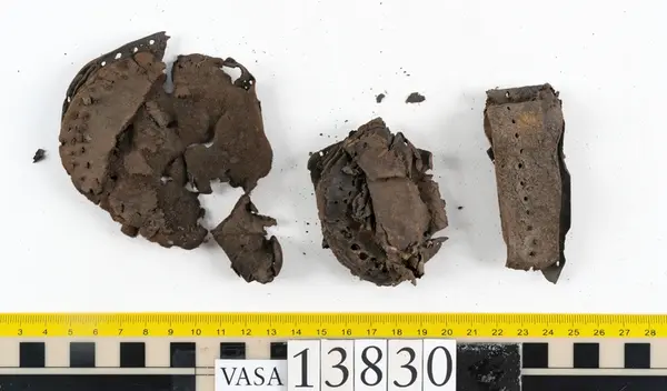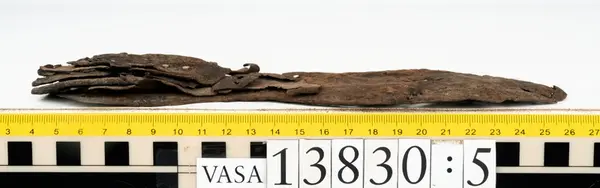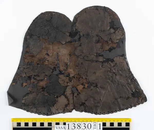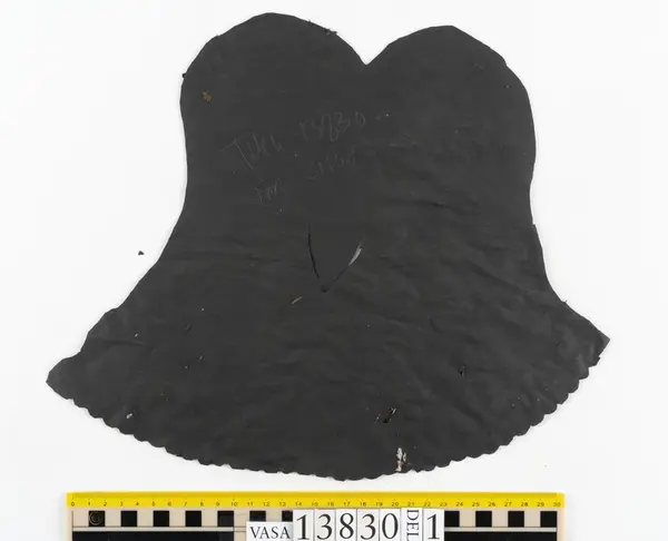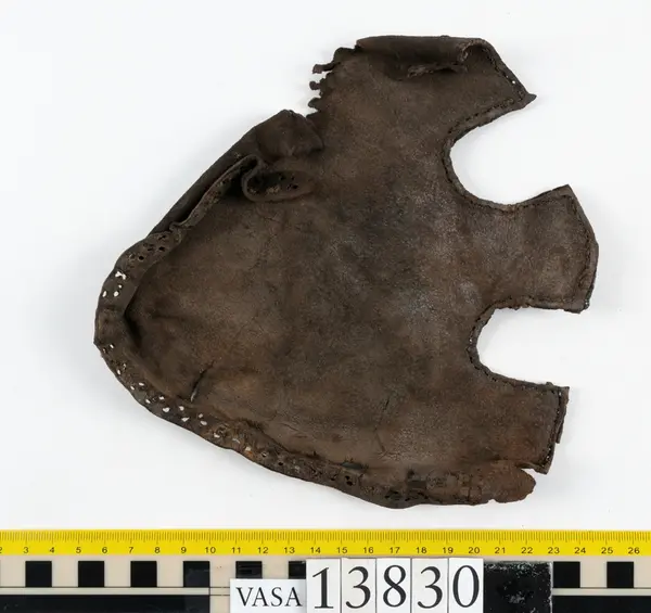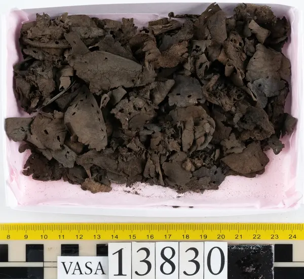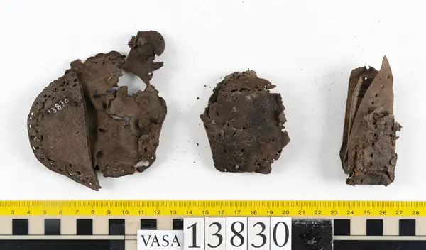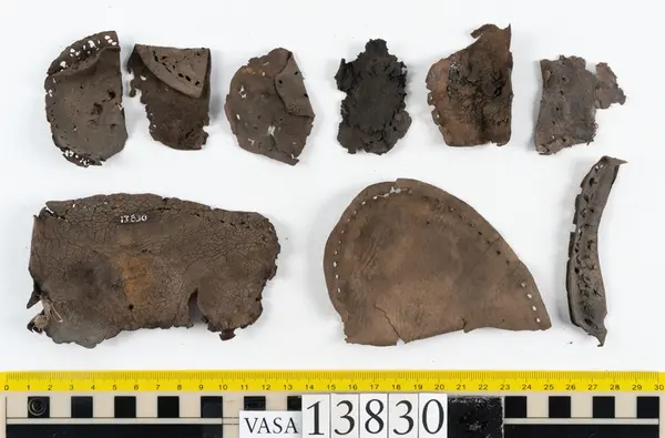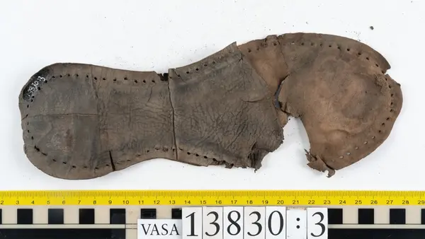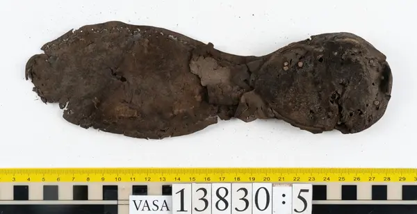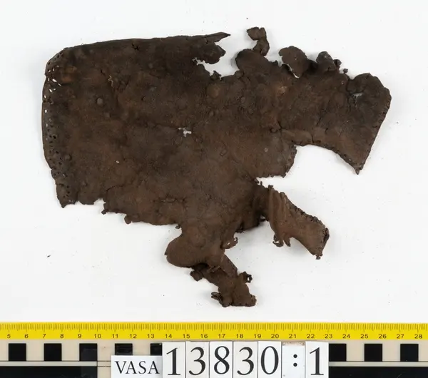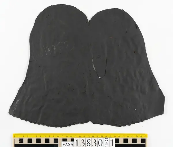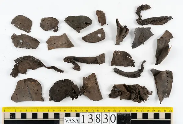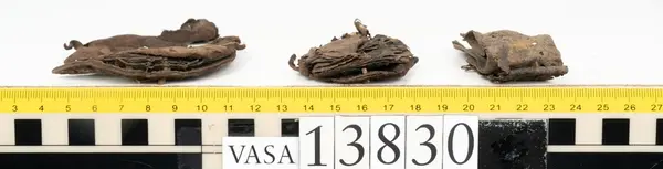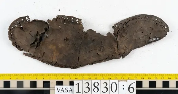 Well over 1400 shoe and boot parts have been found on Vasa. Between the end of the 16th century and the mid 17th century, three types of footwear dominated fashion. These were the latchet shoe, the boot and the pantable slipper, all of which are represented in the Vasa material. The latchet shoe was tied through two straps over the instep. The boot of the early 17th century had a closely fitted shaft of soft leather which could be turned down at the top. Slippers, also called pantables, lacked quarters and often had thicker soles of wood and cork. Some shoes were still made as distinct lefts and rights, although from ca 1580 it was increasingly common to make shoes on an “upright” or straight last, and the shoes would become matched to the left and right foot through wear. Elevated heels first gained popularity throughout western Europe in the late 16th century; before then shoes were flat soled. Both flat soles and elevated heels are seen in the Vasa shoes. Leather of various types could be used for any part of the shoe, but some shoes include birchbark midsole layers for insulation or waterproofing, and pantables often had wood and cork in the sole.