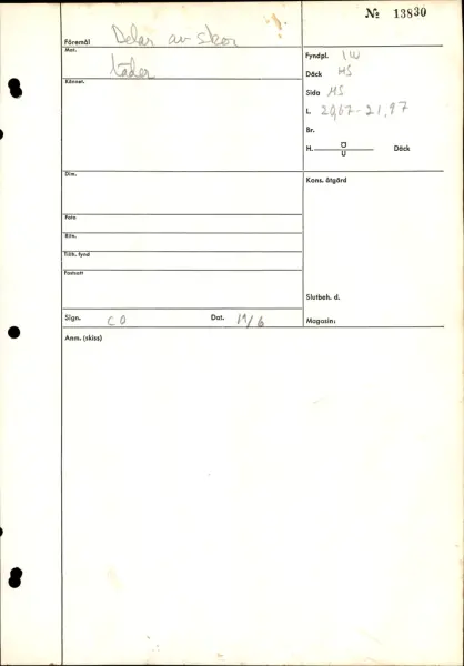 Delar och fragment från sko. Troligtvis innehåller fyndnummer 13830 delar av den sko från vilket ovanläder 31093 härrör.