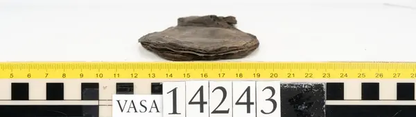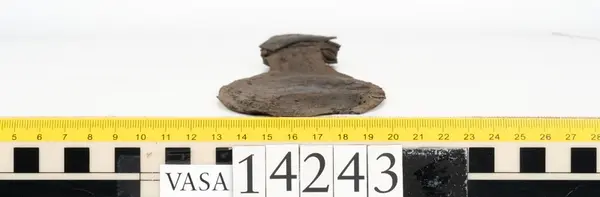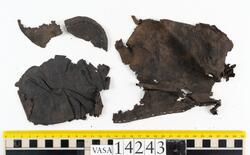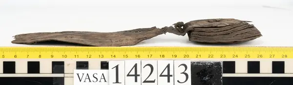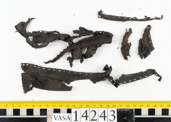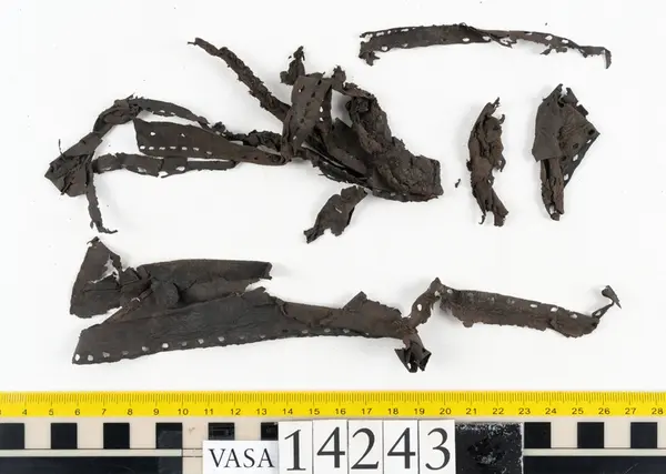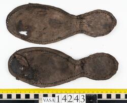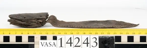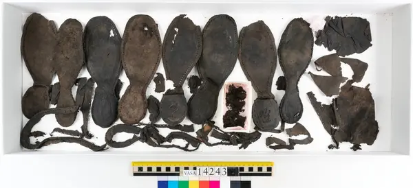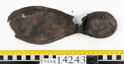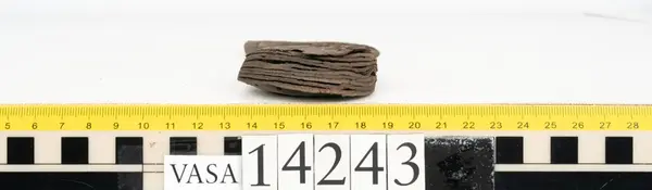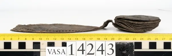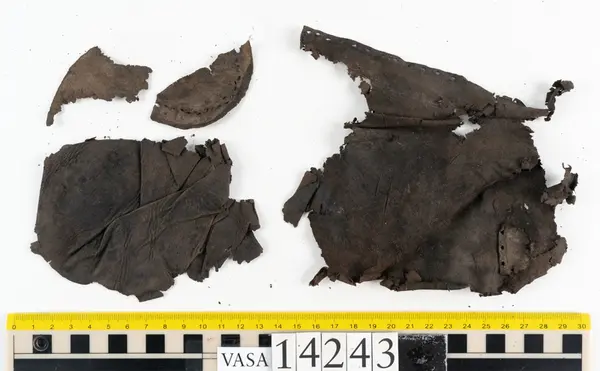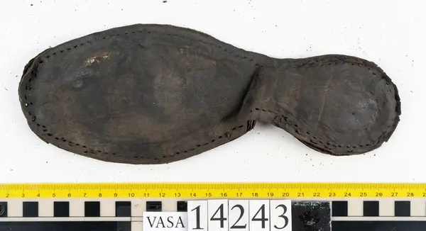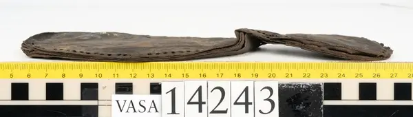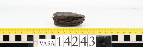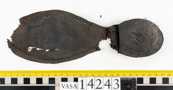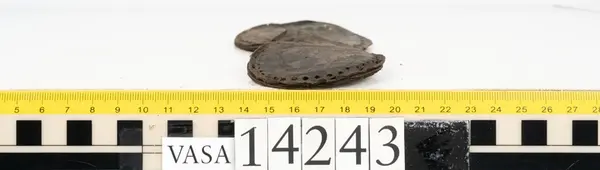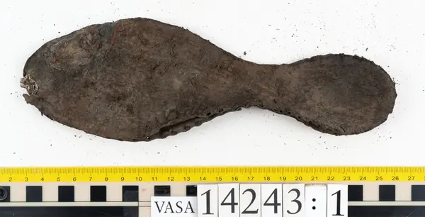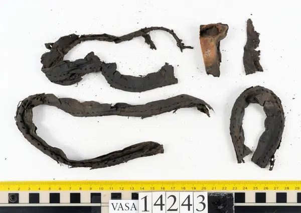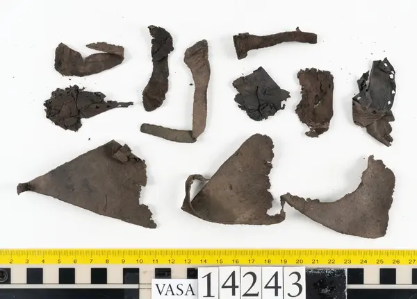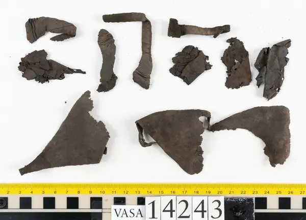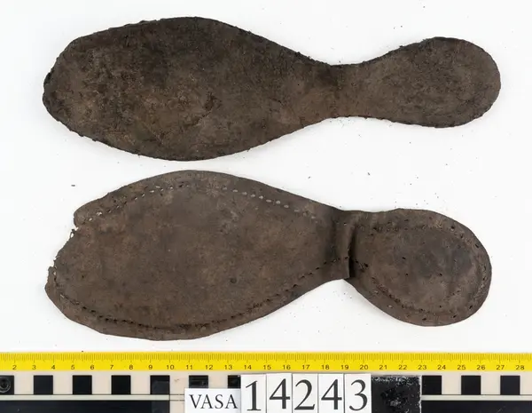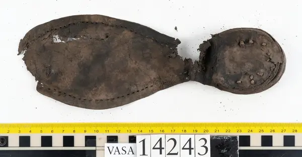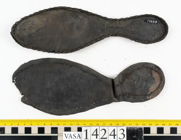 Well over 1400 shoe and boot parts have been found on Vasa. Between the end of the 16th century and the mid 17th century, three types of footwear dominated fashion. These were the latchet shoe, the boot and the pantable slipper, all of which are represented in the Vasa material. The latchet shoe was tied through two straps over the instep. The boot of the early 17th century had a closely fitted shaft of soft leather which could be turned down at the top. Slippers, also called pantables, lacked quarters and often had thicker soles of wood and cork. Some shoes were still made as distinct lefts and rights, although from ca 1580 it was increasingly common to make shoes on an “upright” or straight last, and the shoes would become matched to the left and right foot through wear. Elevated heels first gained popularity throughout western Europe in the late 16th century; before then shoes were flat soled. Both flat soles and elevated heels are seen in the Vasa shoes. Leather of various types could be used for any part of the shoe, but some shoes include birchbark midsole layers for insulation or waterproofing, and pantables often had wood and cork in the sole.