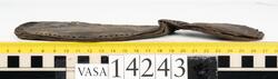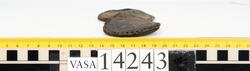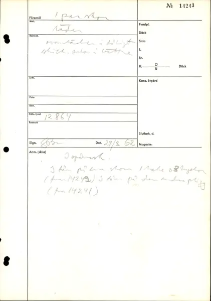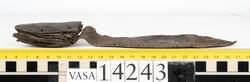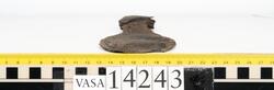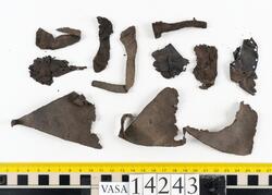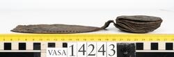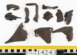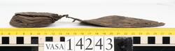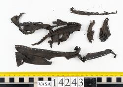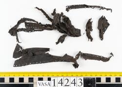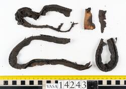 I tåpartiet på den ena skon låg en hake och tre hyskor av metall, fyndnummer 14242. I tåpartiet på den andra skon låg skopligg, fyndnummer 14241.