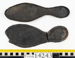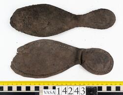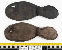 Två skobottnar samt ovanläder från en, troligtvis, sandalsydd sko.