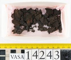 Skolädret påträffades i spånask fyndnummer 12864 som låg i tunna fyndnummer 12865.