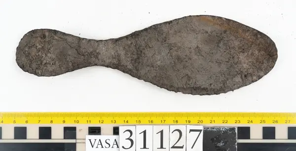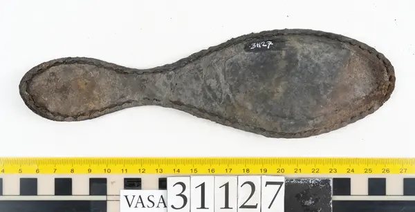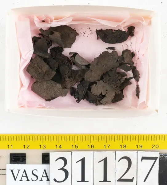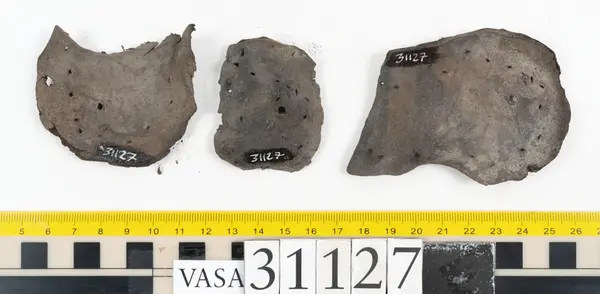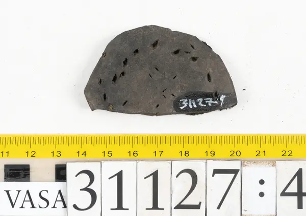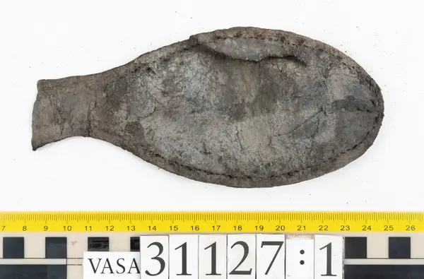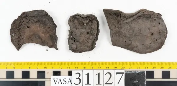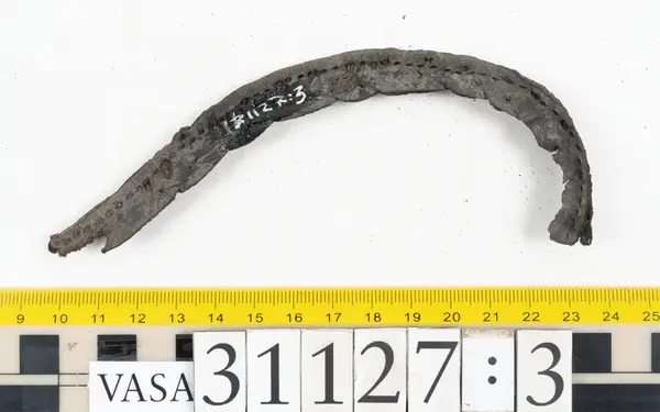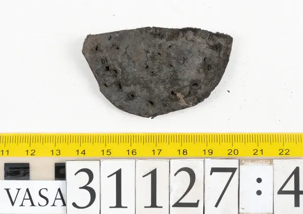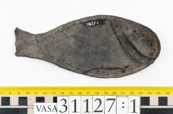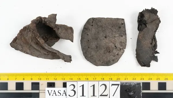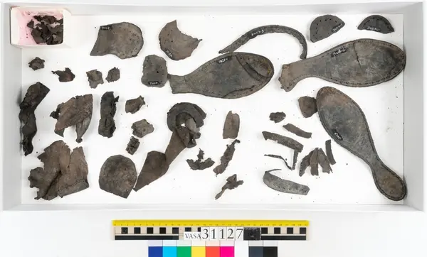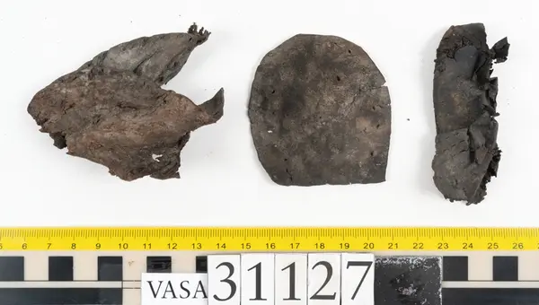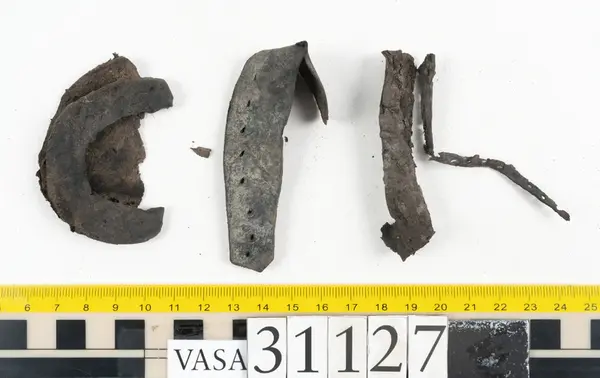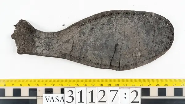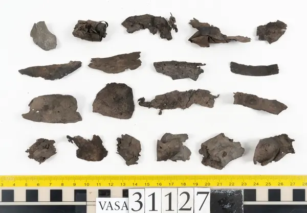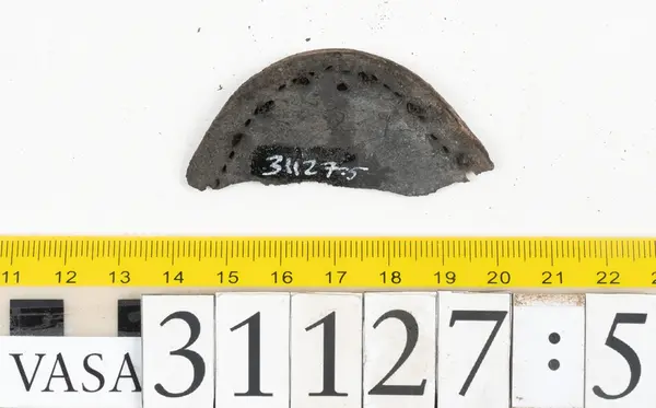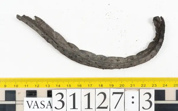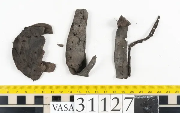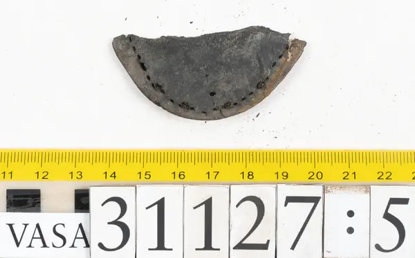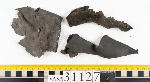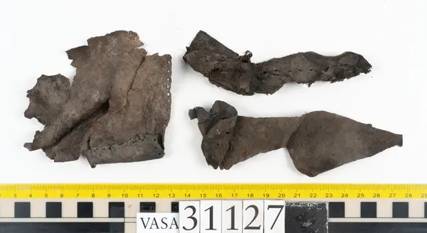 Well over 1400 shoe and boot parts have been found on Vasa. Between the end of the 16th century and the mid 17th century, three types of footwear dominated fashion. These were the latchet shoe, the boot and the pantable slipper, all of which are represented in the Vasa material. The latchet shoe was tied through two straps over the instep. The boot of the early 17th century had a closely fitted shaft of soft leather which could be turned down at the top. Slippers, also called pantables, lacked quarters and often had thicker soles of wood and cork. Some shoes were still made as distinct lefts and rights, although from ca 1580 it was increasingly common to make shoes on an “upright” or straight last, and the shoes would become matched to the left and right foot through wear. Elevated heels first gained popularity throughout western Europe in the late 16th century; before then shoes were flat soled. Both flat soles and elevated heels are seen in the Vasa shoes. Leather of various types could be used for any part of the shoe, but some shoes include birchbark midsole layers for insulation or waterproofing, and pantables often had wood and cork in the sole.