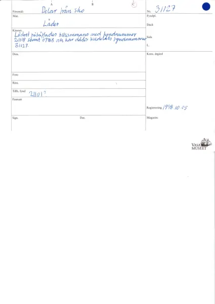 Vid inventeringen 1998 påträffades lädret tillsammans med fyndbrickor 21118 samt 07768. Enligt uppgifter från utgrävningen omfattar fyndnummer 21118 en skosula samt diverse läderbitar medan fyndnummer 07768 omfattar skodon. Lädret tilldelades ett nytt fyndnummer, 31127, då det ej gick att klargöra från vilket av dessa fynd det härrörde.