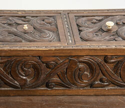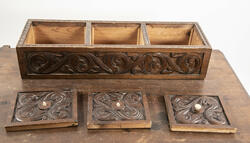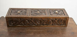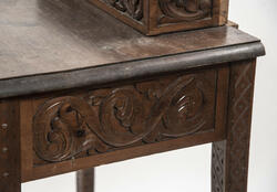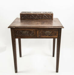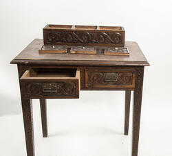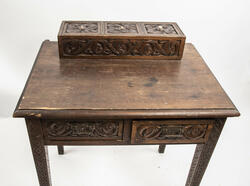 LIte bord med to skuffer og en boks på toppen. Fronten på skuffene, sidene på bordet, og boksen på toppen er skåret ut i tradisjonelt norsk akantusranke-mønster. Beina er skåre ut med geometriske mønstre på alle sider. Bordplata har en øvre del med rette kanter, men så buer den seg utover, så undersiden av bordet er større enn o... LIte bord med to skuffer og en boks på toppen. Fronten på skuffene, sidene på bordet, og boksen på toppen er skåret ut i tradisjonelt norsk akantusranke-mønster. Beina er skåre ut med geometriske mønstre på alle sider. Bordplata har en øvre del med rette kanter, men så buer den seg utover, så undersiden av bordet er større enn oversiden. Skuffene har håndtak av metall. Boksen er delt i tre rom med lokk. Lokkene er også skåret ut i samme mønster. De løftes ved hjelp av små håndtak, muligens av elfenben. To av disse er ødelagte. Boksen har helt tydelig vært festet i bordet, det er spor etter festene på hver side av boksen, og på baksiden av bordet er det skåret inn to hakk, et på hver side av boksen, disse er ca. 7 cm brede. I hver av disse hakkene står en bøyd, rusten spiker. På høyre side, sett forfra, har den biten av bordet som skulle vært på utsiden av hakket forsvunnet. Siden festet har blitt borte, er boksen nå løs.