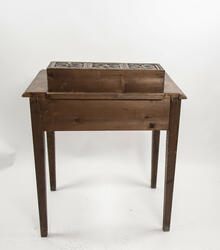 LIte bord med to skuffer og en boks på toppen. Fronten på skuffene, sidene på bordet, og boksen på toppen er skåret ut i tradisjonelt norsk akantusranke-mønster. Beina er skåre ut med geometriske mønstre på alle sider. Bordplata har en øvre del med rette kanter, men så buer den seg utover, så undersiden av bordet er større enn oversiden. Skuffene har håndtak av metall. Boksen er delt i tre rom med lokk. Lokkene er også skåret ut i samme mønster. De løftes ved hjelp av små håndtak, muligens av elfenben. To av disse er ødelagte. Boksen har helt tydelig vært festet i bordet, det er spor etter festene på hver side av boksen, og på baksiden av bordet er det skåret inn to hakk, et på hver side av boksen, disse er ca. 7 cm brede. I hver av disse hakkene står en bøyd, rusten spiker. På høyre side, sett forfra, har den biten av bordet som skulle vært på utsiden av hakket forsvunnet. Siden festet har blitt borte, er boksen nå løs.