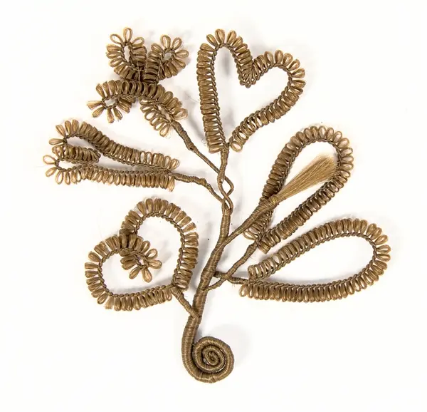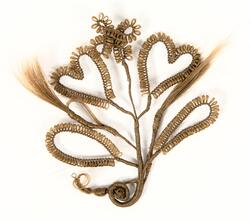Hårarbeten utförda av en okänd "dalkulla" i Göteborg under slutet av 1800-talet. Håren kommer från Maria Josefina Karlsson (1864 - 1941) samt hennes söner: Josef (1888 - 1897) och Conrad (1890 - 1896). Enligt dottern Alice skall klockkedjan vara gjord av Maria Josefinas hår. Den ljusaste broschen skall vara av Konrads hår, och den lite mörkare av Josefs.