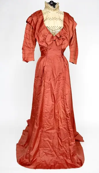 Kjolen var selskapskjolen til brudens mor. Brudekjolen har GM nr 031171 A-C. Bruden hadde også en selskapskjole (GM.031171 A-C). Vielsen var i Vinger kirke, Kongsvinger ca 1900.- Giver/siste eierMork, Aslaugsikker