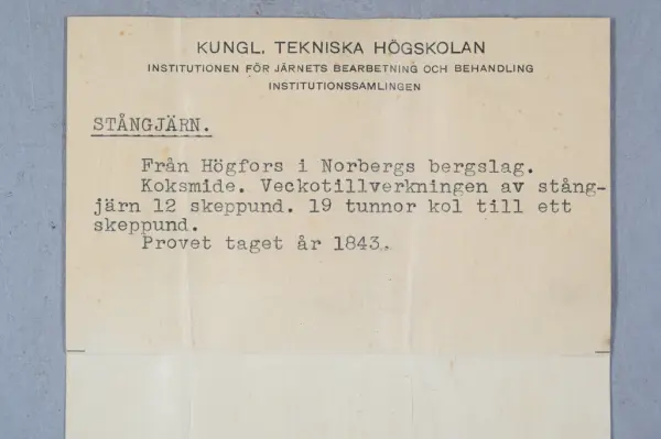 - Detta föremål ingår i en samling prover från KTH som togs emot 1963. Samlingen består mest av metallprover men det finns även annat material.