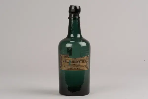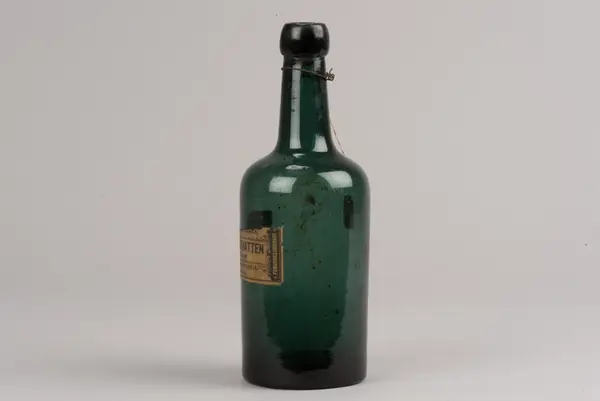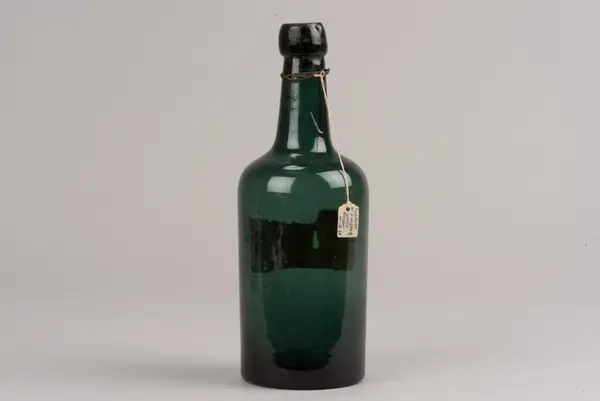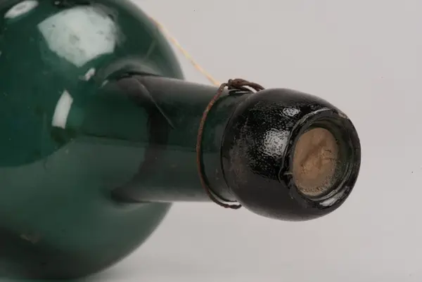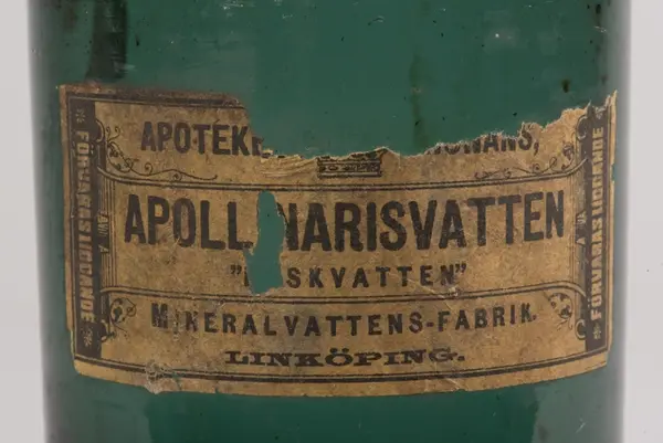 - På en hängetikett, eventuellt från accessionstillfället, framgår att flaskan hittats i "gamla skolan".