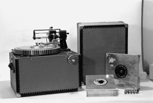 Inspelningsapparat för grammofonskivor 78 varv/min. Drivning med gummirem. Elmotor (General Industries Co, Ohio, 220V) senare monterad utanpå lådan.