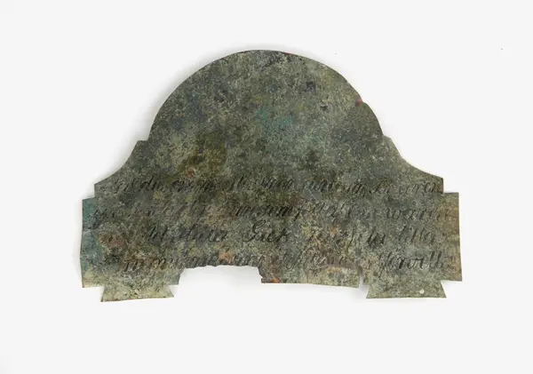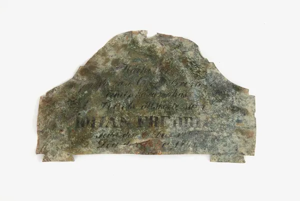 Johan Fredrik Bromzelius född 6/12 1845 i Falu Kristine (W) död 14/10 1846 i Falu Kristine (W) begravd där 23/10 1846 son till kopparslagaren Carl Fredrik Bromzelius (f.10/2 1809 i Falun ) och hans hustru Christina Swart (f. 9/11 1811 i Aspeboda) Eftersom personen är begravd på Falu Kristine kyrkogård får man väl anta att plåten kommer därifrån.