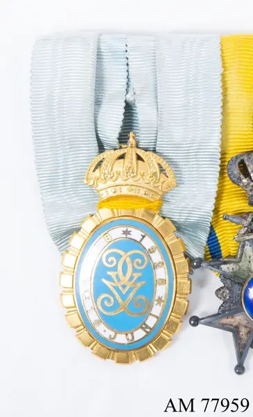 Åtsidan: Minnestecknet består innerst av en oval av mellanblå emalj varå i guld är inlagt Konungens spegelmonogram, närmast utanför en smal genom en genom en guldrand skild oval av...