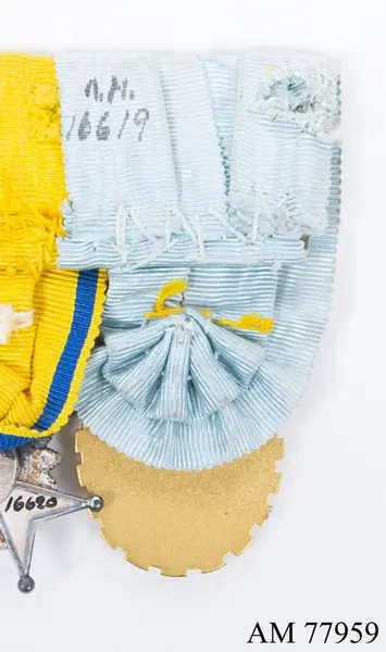 Subject Åtsidan: Minnestecknet består innerst av en oval av mellanblå emalj varå i guld är inlagt Konungens spegelmonogram, närmast utanför en smal genom en genom en guldrand skild oval av vit emalj, varpå finnes inlagt likaledes i guld 1858 1928 16. JUNI. Utanför den vita ovalen ånyo en blå oval med guldkanter, allt detta lagt på en oval av gul metall, försedd med täta utsirningar, gående från tecknets medelpunkt och utåt, överst en kunglig krona med en ring för bandet.