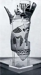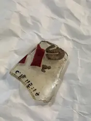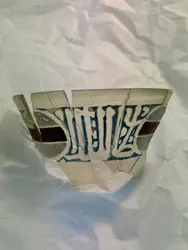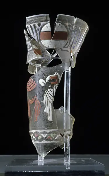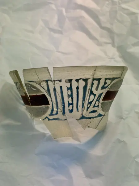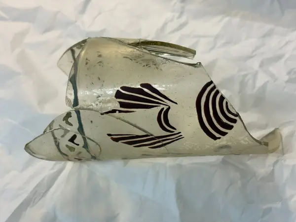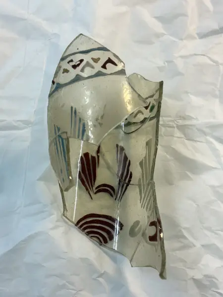 Bägaren påträffades i avfallslagren. Kol och sot tyder på att den tidigare medeltida byggnaden på tomten brunnit.Fyndet är mycket ovanligt. Glaset har tillverkats i Damaskus eller Alleppo omkring år 1290. Skärvor av liknande slag har hittats i Vreta Klosterruin.