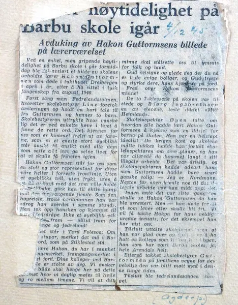 - Sitat fra Agderposten 4. 12. 1945: " Ved en enkel, men gripende hytidelighet på Barbu skole i går formiddag ble det avslørt et bilde av skolens avholdte lærer Håkon Guttormsen som døde i tukthuset Dreibergen i april i år etter å ha sittet i tysk fangenskap fra august 1940. "